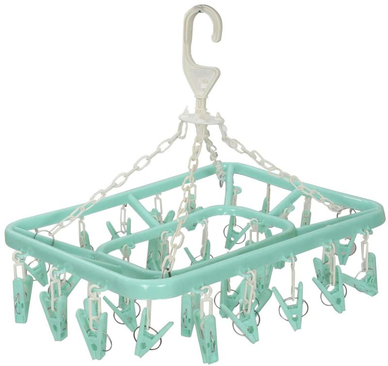 This hanging drying rack is a practical and space-saving solution for drying small laundry items. It features a sturdy plastic frame with multiple strong clips, ideal for drying socks, undergarments, baby clothes, handkerchiefs, and more. The durable hook at the top allows you to hang it on rods, clotheslines, or even in bathrooms. Its foldable design makes it easy to store when not in use, and the lightweight yet robust construction ensures long-lasting performance.